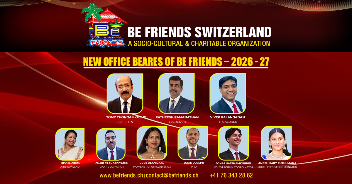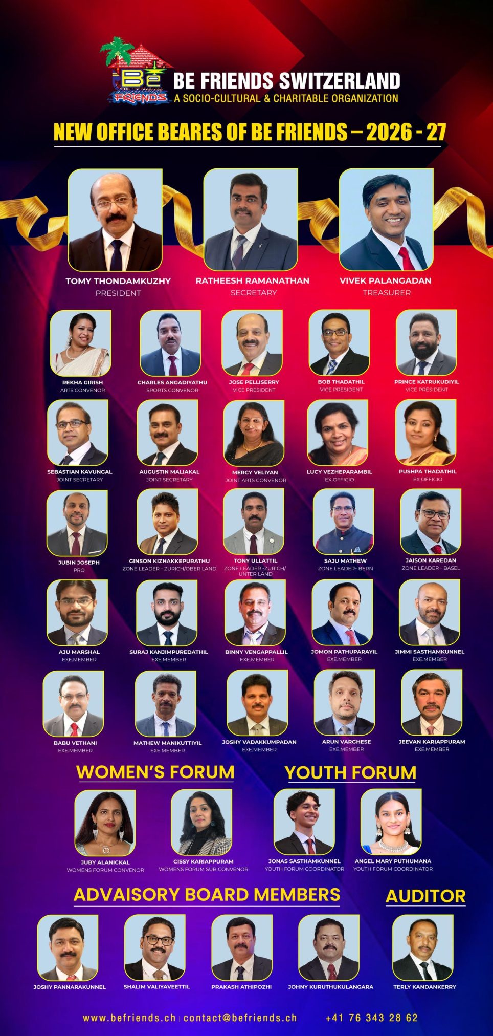 കഴിഞ്ഞ 23 വർഷക്കാലം സ്വിറ്റ്സർലാൻഡിലെ മലയാളി മനസുകളിൽ പ്രവർത്തനമികവുകൊണ്ടും , സംഘാടന ശേഷികൊണ്ടും ചിരപ്രതിഷ്ട നേടിയ ബി ഫ്രണ്ട്സ് സിൽവർ ജൂബിലി ആഘോഷങ്ങളിലേക്ക് പ്രവേശിക്കുന്ന വർഷമായ 2026 -27 വർഷത്തേക്കുള്ള ഭാരവാഹികളെ തെരെഞ്ഞെടുത്തത്